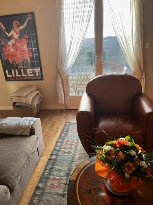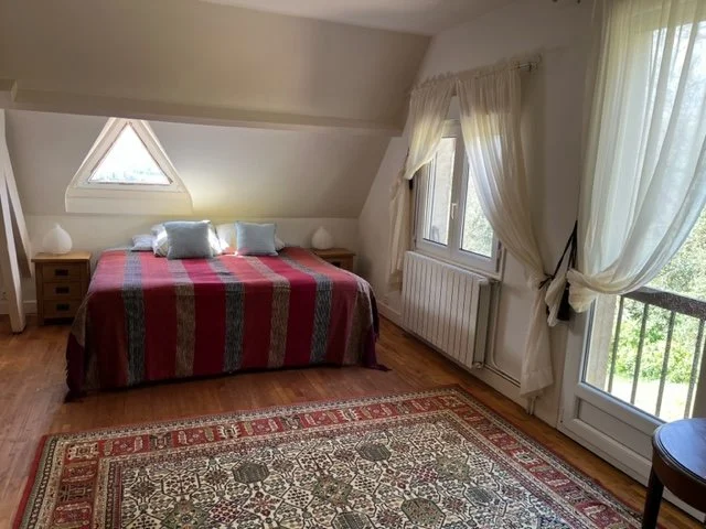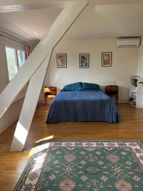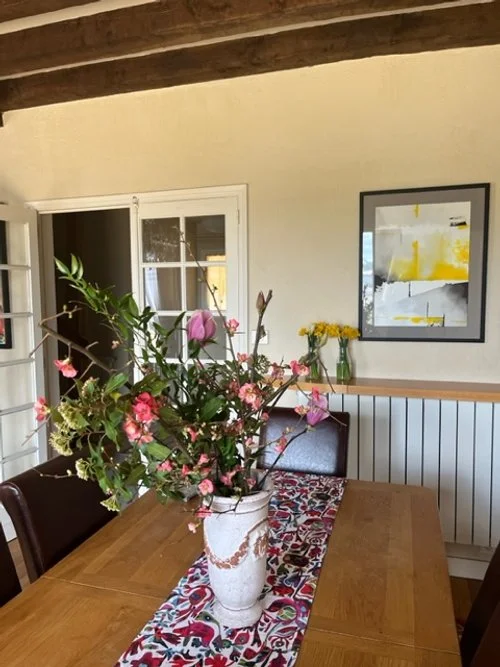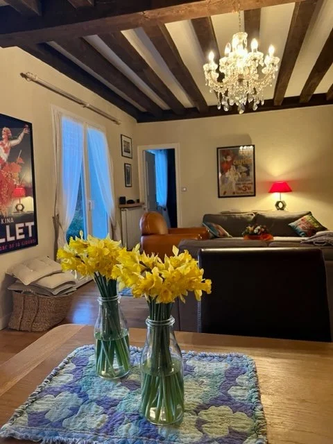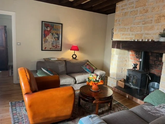 Downstairs our home has an open plan dining/ living room with a wood-burning stove, a spacious kitchen, 2 bedrooms and 1 and a 1/2 baths. French doors lead out to the broad terrace with lounges and a natural teakwood table that seats 12. Upstairs are two large bedrooms and a full bathroom with tub and shower.